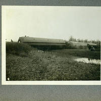 Black and white image of several train cars lying on their sides. Several men are seen looking into one car, and three women, one who holds a baby, are gathered around a small fire on the ground in the right of the image, observing the wreck. The ground appears to be muddy and overgrown, and a small creek or slough runs through the center of the image. The accident took place just west of Forest Grove, and was a result of a broken rail, which splintered after the engine and baggage cars had passed, derailing the smoking car and two coaches. Three people were killed in the accident, a man from McMinnville, and a woman and her infant child from Portland.