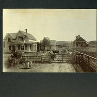 Sepia-toned image of a cross-gabled, Queen Anne-style house with two outbuildings and a large barn. The house has two dormer windows, one of which extends into a balcony over a large front window. A porch wraps around the front of the house. A decorative fence runs along the front edge of the yard, next to a fenced lane leading back to the barn and outbuildings. Several cows stand in the lane, and a small cart with two milk cans on it stands in front of the fence.