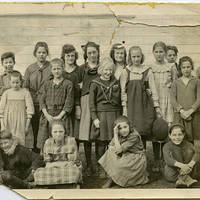 Black and white image of a number of children standing outside of a building. Some students are seated in front of the group, including two boys who appear to be almost wrestling. The girls wear knee-length skirts, many made of plaid material, while some wear pinafores or sailor style shirts. The boys wear overalls or pants with suspenders.