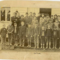 Sepia-toned image of a group of school students standing on the porch and a temporary step outside of their building. Most of the boys wear coats and pants, some wear short pants and one boy has a ruffled collar. The girls wear print and patterned dresses of varying fabrics, and most wear their hair pulled back from their faces. Two men stand at the left of the group, one just visible behind the other. The school has broken out windows and an open door.