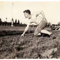 An unidentified Pacific University football player poses for a photo in a defensive crouch.