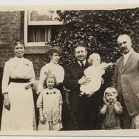 Professor of English Mary Frances Farnham (far left) and Academy Principal Henry Liberty Bates (far right) greet the H.O. Hills family in front of the female dormitory, Herrick Hall in the late 1900's.