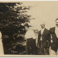 Professor of English Mary Frances Farnham (far left) and Academy Principal Henry Liberty Bates (middle right) greet the Shippee[?] family near the female dormitory, Herrick Hall in the early 1900's.