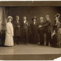 Pacific University students pose for a picture dressed in theatre performance attire in the mid 1900's. (Left to right) Grace Payne, Jimmy Ward, Herman Witham, Minnie Heidel, Bill Gwynn, Robert Imlay, and Frances Clapp are pictured. Frances graduated from Pacific and became a missionary and teacher in Japan and praised for her influential teaching while there.