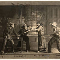 Photo of the performance 'The Great Divide' at Pacific University in the early 1900's. Pictured are (left to right) Joe McCoy, Arthur Ireland, Alice Smith Gregg, and Herbert Duell.