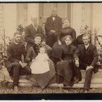 Outdoor portrait of the Bump family. While the individuals are not specifically identified, the man with the long beard is Doctor Orlo M. Bump, who was born in 1832 and died in 1921 in Salisbury, Vermont. The woman on the top right is Angeline King Bump, wife of Orlo M. Bump, who was born in 1837 and died in 1825 in Salisbury, Vermont. According to a family descendant, Cyrus Bump (d. 1890), may be the man seated at top; his son William and stepdaughter Emma with their spouses are in the front row.