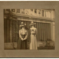 Two Tualatin Academy students standing near Herrick Hall at Pacific University. Possibly Josephine Clare Harriman on the left and Emma Wavelle Cunningham on the right