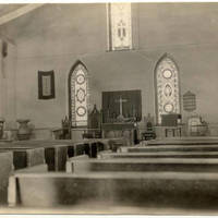 The Christ Church in Wayside (Newberg), Maryland is still standing today. This church is linked to Tabitha Brown, who helped found the Tualatin Academy which became Pacific University. Brown's husband Reverend Clark Brown is buried on the church grounds. The back of the photo reads, Looking across the old box pews. Two doors can be seen standing open, but most of them have been taken off. Pulpit at left.