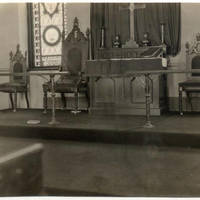 [Back] Rev. Clark Brown and Rev. Benjamin Contee are buried beneath the floor and beside the altar, but we do not know which is which. I placed the two hymnals on the floor. If Clark Brown rests on the left, his head would be about under the nearer book. His head is toward the west.