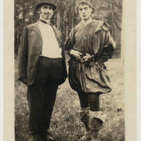 - Pacific University students posing for a photograph in theater costumes. Cleo Howell class of 1924 is possibly the student on the right.