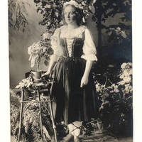 In the 1900's, an unidentified student at Pacific University dresses a costume for a theatre performance.