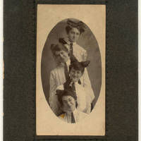 Portrait of four school girls. They are identified as: Josephine Clare Harriman, who attended Tualatin Academy around 1902 as a special student; Maie Versey Peel who attended Pacific University as a special student during 1902; Florence Tongue, who attended Tualatin Academy and the Conservatory of Music around 1902; and Una Pearl Wilson, who also attended the Conservatory around 1902.