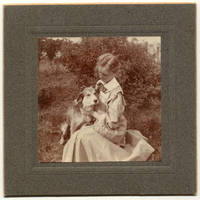 An unidentified woman petting a dog. This photograph was likely made in Oregon in the early 1900s, possibly in or near Forest Grove. The woman likely has a connection to Pacific University.