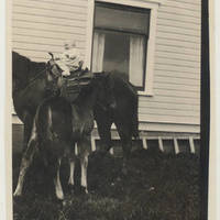 Photo of an unidentified baby seated in a saddle on a horse in the early 1900's.
