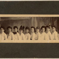 Students at Pacific University pose for a group photo. Mary Blade (second from left) and Ruth Fitch Wills (third from left) our identified in the photo taken in the 1900's.