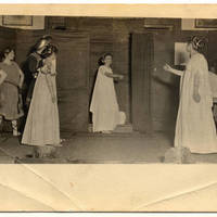 Tualatin Academy student Beula Belle Ireland, possibly Pacific Conservatory of Music student Lillian Belle Elder, Tualatin Academy student Elizabeth (Bessie) Hope, Pacific University student, class of 1912 Myrtle May Bunday, Pacific Conservatory of Music student Norma Minkler and Pacific University student Lois McLeod in costume for Pygmalion and Galatea. Unidentified person with the initials M.E. playing the soldier.