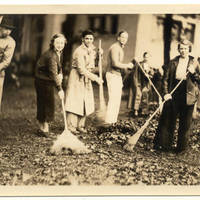 Photograph of Pacific University students and faculty raking leaves at the annual Clean-up Day. Present is Andrewa Noble, Class of 1929, who became a professor of mathematics there.