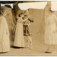 Pacific University student Louis McLeod, Tualatin Academy student Elizabeth (Bessie) Hope, unidentifiable person with the initials M.E. and Pacific University student Genevieve Montague Courtney in costume for the play Pygmalion and Galatea.