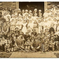 Postcard of Hard Time Day at Pacific University. Identified are: Charles Joseph Bushnell, Pacific's president; William Martin Proctor, university Dean; Zenas Austin Olson, Class of 1915; Glenn Robert Jack, Class of 1918; Max Moore Reeher, Class of 1917; Thomas Reuben Roe, Class of 1918; John Vernon Ireland, Class of 1919; Byron Matthew Goodman, Class of 1918; Harold Arthur Reed, Class of 1918; Newton Conger McCoy, Class of 1918; Edwy Olds Dibble, Class of 1916; Thayne Miller Livesay, Class of 1918; Watt Andrew Long, Class of 1918; Joseph Henry McCoy, Class of 1917; Jay Richard Austin, Class of 1916; Allan Edward Harris, Class of 1918; Lester Tallmon Jones, Class of 1918; Edward Vincent Burns, who attended Pacific around 1914; Edward Meakin Livingston, Class of 1917; Raymond Dwight Frost, Class of 1919; Willis Lawrence Cady, Class of 1919; Lura Tamiesie, Class of 1915; Marie L. Wells, Class of 1916, who was the secretary of the 1914 student body; Ada F. Taylor, Class of 1915, who was the vice-president of her senior class body; Ruth Hills Cady, Class of 1916; Rita McCrum, Class of 1915; Marjorie K. Hesseltine, Class of 1918; Ruth Josephine Haines, Class of 1917; Elizabeth Marguerite Briggs, Class of 1916; and Grace Elizabeth Haines, Class of 1919.