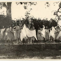 Photograph of female students with white sheets in a theater performance put on by Pacific University, perhaps for May Day.