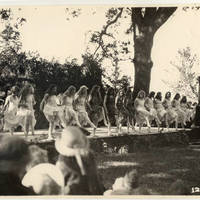 Female students dancing in an outdoor theater production put on by Pacific University, perhaps for May Day.