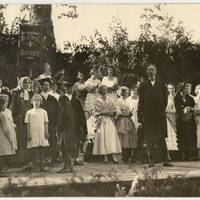 Card photograph of the end of a outdoor performance given by Pacific University, perhaps for May Day.