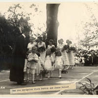 Photograph of a Pacific University procession, perhaps for May Day. There is a young boy carrying a crown in the front.