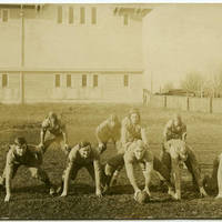 Pacific University football team in defensive position. Pictured are: Arthur Ireland, Class of 1917; Samuel Verle Stanley, Class of 1918; Watt Andrew Long, Class of 1918; Thomas Reuben Roe, Class of 1918; Robert James Rasmusen, Class of 1916; Thayne Miller Livesay, Class of 1918; John Ireland, Class of 1918; Leo Sheridan Lucas, Class of 1918; Reuben Willard Frost, Class of 1917; Byron Matthew Goodman, Class of 1918; and Warren Ernest Tupper, Class of 1916.