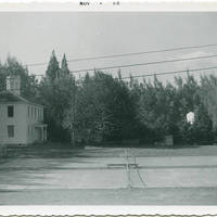 Photo of Old College Hall and the tennis courts in November 1956. Old College Hall was built from 1849-1851. This building has been moved around the campus and can now be seen on College Way. It is open one day a week for tours. The tennis courts were moved and rebuilt in 1983.