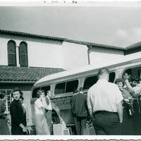 Students from Pacific University visited Altadena, California on March 23, 1958. Pictured loading the bus are Lois Chaffee, Joan Bobcock, Dick Dorsett, Kathy Compton, John Jonson, Jim Romig, Mariam Rattig[?], Darlene Miller, and Stan Drytrik[?].