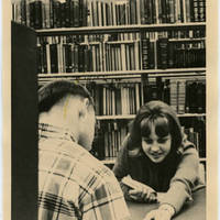 Two students study in the Harvey W. Scott Memorial Library in the 1970's. Scott Library was built in 1967 and named after the first graduate of Pacific University. The building is now known as Scott Hall and houses faculty and staff offices, a language center called the CLIC, tutoring and learning center, and the Kathrin Cawein Gallery of Art.