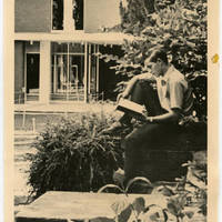 Student studying on the steps of Marsh Hall in the late 1960's. The newly built Harvey W. Scott Memorial Library is in the background.