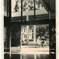 View of patio area outside Washburne Hall, known as the University Center, at Pacific University in the 1970's. Washburne Hall was built in 1964 and houses dining services, the mail room, staff offices, and other student services.