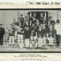 [Front] (See 1924 Heart of Oak) Pacific University's Band One of the Most Active Organizations on the Campus; Pacificana music group; Pacific University Diamond Jubilee Year; forty-three; [Back] Diamond Jubilee is that 75 opera from founding - 1924 ?; Pacific University Library Forest Grove, Oregon; (over);