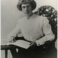 Photograph of an identified woman, possibly a teacher or former Pacific University student, reading.