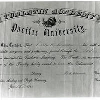 Copy of a certificate of completion from Tualatin Academy for Margaret M. Hinman, Pacific University Class of 1891. D. L. Edwards was the principal at the time.