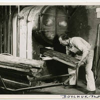A man identified as Virgil Hicks feeds wood into a furnace in the 1920's at Pacific University.