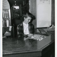 - Pacific University student looking at the catalogue in the Carnegie Building Library.