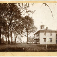 This picture shows original location of Old College Hall and Academy Building; Old building, now Science Hall, erected in 1851. Stood originally on site of Marsh Hall. Return to Z.A Olson Forest, Grove Oregon.
