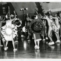 A dance that appears to be by white performers wearing redface, held at a Pacific University alumni dinner, probably in 1959. There were at least two alumni dinners held in 1957-1959 advertised under the title, "Pow-wow Dinner." The event did not actually include Native Americans. From photographs, it appears to have included: white performers dressed in wigs, makeup and costumes performing a fake "pow-wow" dance (visible in this image); university officials wearing Native-style chieftain headdresses; attendees being given headbands with feathers to wear; and decorations mimicking a forest setting. This took place in Pacific University's Old Gymnasium.