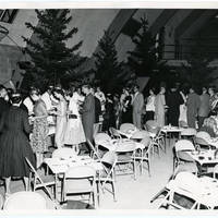 A photograph of attendees wearing redface while in line for a buffet at a Pacific University alumni dinner, held between 1957-1959. There were at least two alumni dinners held during this time period, which were advertised under the title, "Pow-wow Dinner." The event did not actually include Native Americans. From photographs, it appears to have included: white performers dressed in wigs, makeup and costumes; performing a fake "pow-wow" dance; university officials wearing Native-style chieftain headdresses; attendees being given headbands with feathers to wear (visible on the left in this image); and decorations mimicking a forest setting. This took place in Pacific University's Old Gymnasium. The photographer, Herb Drew, was a student at Pacific who took photographs for the student newspaper.