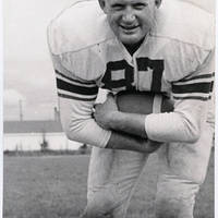A Pacific University football player poses with the football. The photo was previously cropped and the biographical information on the back lost, except that he played receiver.