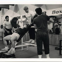 A Pacific University student lifting weight with three spotters.