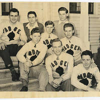 A group of Pacific University students in matching sweaters pose for a photo. The young men are identified as follows. Back row: Eugene Petroff, Enoch LaRoy Dillon (graduated 1948), John Robert Meyer (graduated 1949), Peter S. Ford (graduated 1945). Middle row: Duane V. Waln, Jr. (graduated 1949) and Warren Vadman. Last row: Trevor Allan Hausske (graduated in 1946) and Don Edwards.