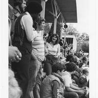 A crowd of Pacific University students in the bleachers. One of the young men, unspecified, is identified as Scott Kanady.