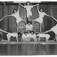 A group of female gymnasts pose for a photo in a pyramid formation.