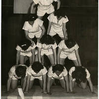 A group of Pacific University gymnasts pose for a photo in a pyramid formation.