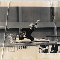 A young woman posing on a gymnastics balance beam.