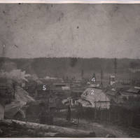 Photo of a town. Streets appear to be muddy and wet, and a path runs along a post and pole fence down from the foreground of the image into the town. A boardwalk runs partially along one side of the street in the foreground. A number of houses and buildings are visible, several with smoke coming from their chimneys. All appear to be wooden construction. Bare-branched and evergreen trees are scattered throughout the buildings. A number of buildings are numbered in white, identified by the legend on the back of the photo. Number one is a church, with a steep gabled roof and a steeple. Number two is a two-story building, white, with a single-story extension and a covered porch area extending from the first floor and a small dormer window on the far end of the roof. Scaffolding has been attached to the end of the building. Number three is a two-story gabled building, long, with a square store front with three double-hung windows above an awning-style roofline that runs above the first story of the building. This extends to a salt-box like roof on the back of the building. Number four is a long, single-story building, with a square front and a covered porch. Number five is a dark colored, gabled building with two visible stories. It is surrounded by a plank fence, and appears to have two entrances, one on the narrower front facing the road and one on the side of the building. Two double-hung windows appear on the second floor, and the door on the side is bracketed by a second pair of windows. Smoke is visible from the chimney towards the front of the building.