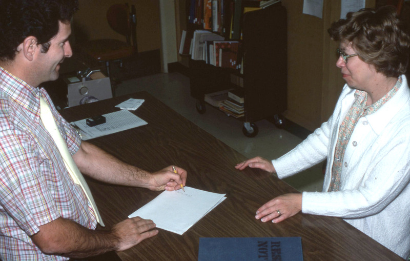 Librarian Alex Toth assisting a patron in Pacific University's Scott Library in July, 1978. This was likely taken in the Reference area of the library. This is one of a set of photographs that appears to have been posed in order to demonstrate the range of work that was taking place in the library.